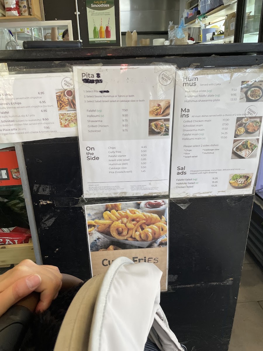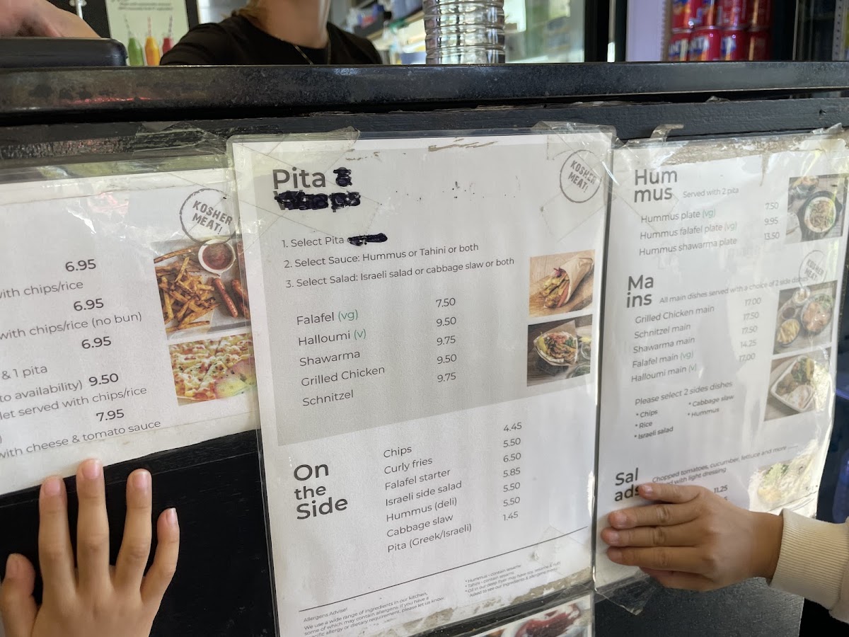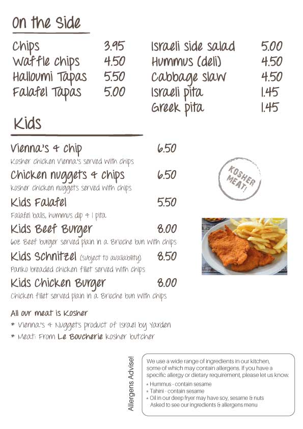 On The Side includes various small dishes and accompaniments such as chips, curly fries, falafel starter, an Israeli side salad, hummus, cabbage slaw, and pita bread. These items can be ordered individually or alongside main dishes.